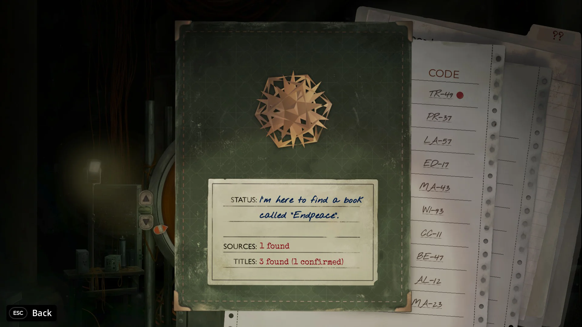 The act of playing TR-49 is another aspect that feels intentionally constrained. There’s a first-person view, seemingly from Abbi’s perspective, looking at the machine’s interface while operating it. The entirety of the game occurs at this interface, with an intercom as your only link to the external world. It’s also a tight loop of examining entries, reading notes, talking to your “handler” Liam every so often, and repeating. This could be very monotonous, but it does not feel that way because the game encourages you to freely imagine associations between entries and figure out codes for new books. A simple example: you read an entry and notice a reference to another work the author wrote “two years later.” You could try adding two to your existing code, as the numbers often reference years or dates. This process feels conducive to a flow state until you hit the next dead end, though I never was stuck for long and was able to quickly find new leads to follow, especially after leaving the game and coming back.
